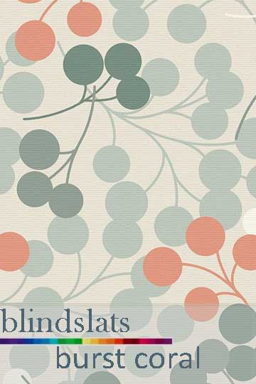 89mm Burst Coral replacement vertical blind slats made to measure. Bold abstract multicolour berries pattern primarily dusky featured colours printed on one side with a plain fabric backing.