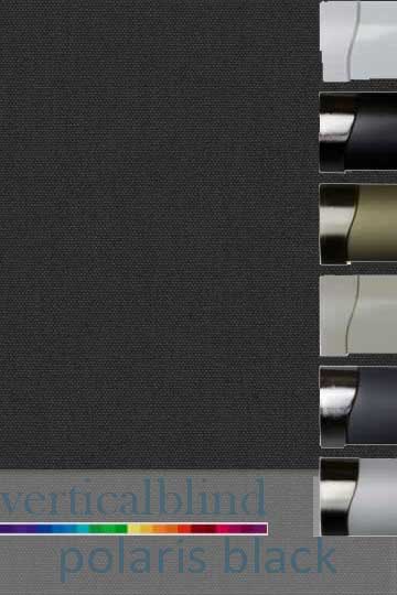 Made to measure complete vertical blind with Polaris Black fabric louvres.