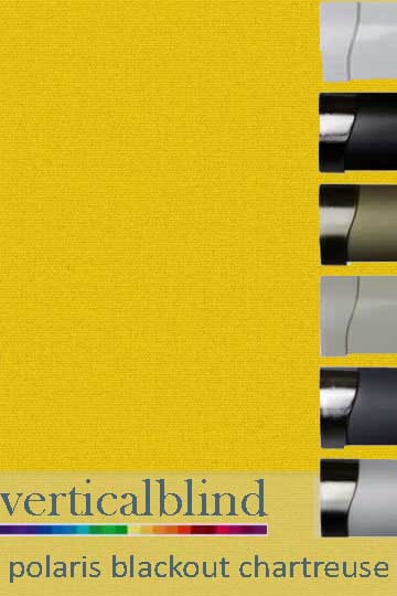 Made to measure complete vertical blind with Polaris Blackout Chartreuse fabric louvres.